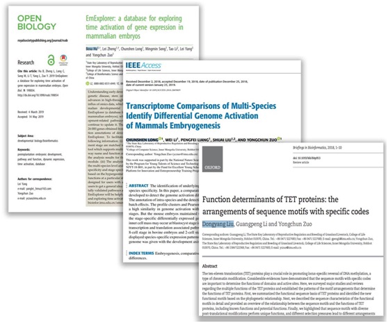 6月6日,公司2014级生物技术基地呼博苏同学在其本科学习阶段完成的关于哺乳动物早期胚胎发育全基因时序性激活的在线分析平台研究,论文题目为EmExplorer: a database for exploring time activation of gene expression in mammalian embryos的科研成果被英国皇家学会出版社下设Open Biology期刊(中科院JCR二区期刊,2018 IF: 3.890)在线发表。同年1月,2014级生物科学基地龙春申同学在本科阶段完成的关于哺乳动物植入前胚胎发育全基因组激活的物种特异性转录组比较的方法学论文,题目为Transcriptome comparisons of multi-species identify differential genome activation of mammals embryogenesis的科研成果被IEEE协会出版社下设IEEE access期刊(中科院JCR二区期刊,2018 IF: 4.098)在线发表。另外,2018年6月,2014级生物科学基地刘东阳同学在其本科学习阶段完成的关于TET蛋白发挥DNA去甲基化催化功能的序列基础研究成果,论文题目为Function determinants of TET proteins: the arrangements of sequence motifs with specific codes的科研成果被英国牛津大学出版集团下设的生物信息学领域权威期刊Briefings in Bioinformatics(中科院JCR一区TOP期刊,2018IF: 9.101)在线发表。