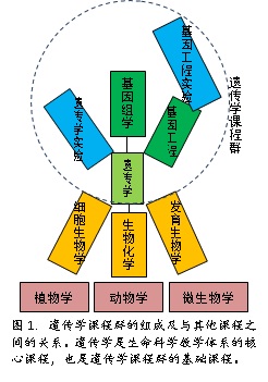 遗传学的教学内容主要由经典遗传学、现代遗传学(也称基因学)、数量性状遗传学以及群体与进化遗传学等内容组成,是学习基因工程和基因组学的基础,是生物学的主干基础课程之一,也是整个生命科学研究和教学的核心学科。基因组学的教学内容是基因组的结构与功能及其研究方法和策略,是遗传学的延伸与发展。基因工程的教学内容主要是基因克隆、载体构建、转化鉴定和诱导表达的原理与技术。现代基因工程已经发展到基因组工程,因此基因工程是遗传学和基因组学的应用。