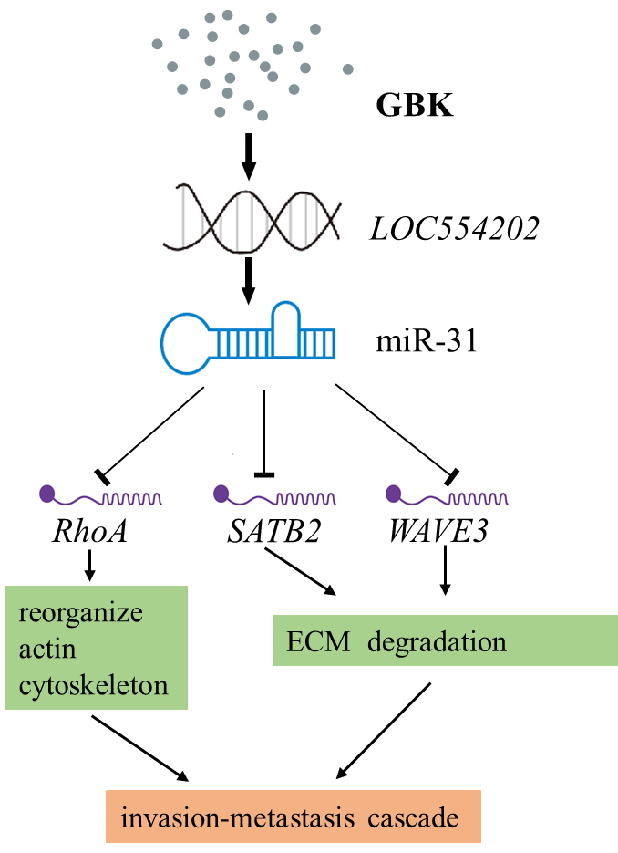 团队还发现胡椒酸钾(potassium piperate, GBK,传统蒙药荜茇提取物)能够通过上调肿瘤抑制基因miR-31的表达而抑制乳腺癌细胞迁移相关蛋白RhoA、WAVE3及SATB2的表达,进而达到抑制细胞迁移的作用。与顺铂及依托泊苷的联合用药可以促进miR-31表达上调,同时与细胞迁移密切相关的miR-31靶基因SATB2表达受到抑制。小鼠肿瘤异种移植模型证实GBK与化疗药物联合用药可以更加显著的抑制肿瘤增长。这些结果表明GBK以miR-31为作用靶点,通过促进其表达而抑制乳腺癌细胞迁移;GBK与化疗药物联合作用可增强肿瘤抑制效果,有望开发为乳腺癌临床治疗的辅助药物。该成果以题为“The antihyperlipidemic drug potassium piperonate impairs the migration and tumorigenesis of breast cancer cells via the upregulation of miR-31” 发表在Frontiers in Oncology上。博士生田晓霞和硕士生卢君萍为该文共同第一作者,范丽菲副教授为本文通讯作者。