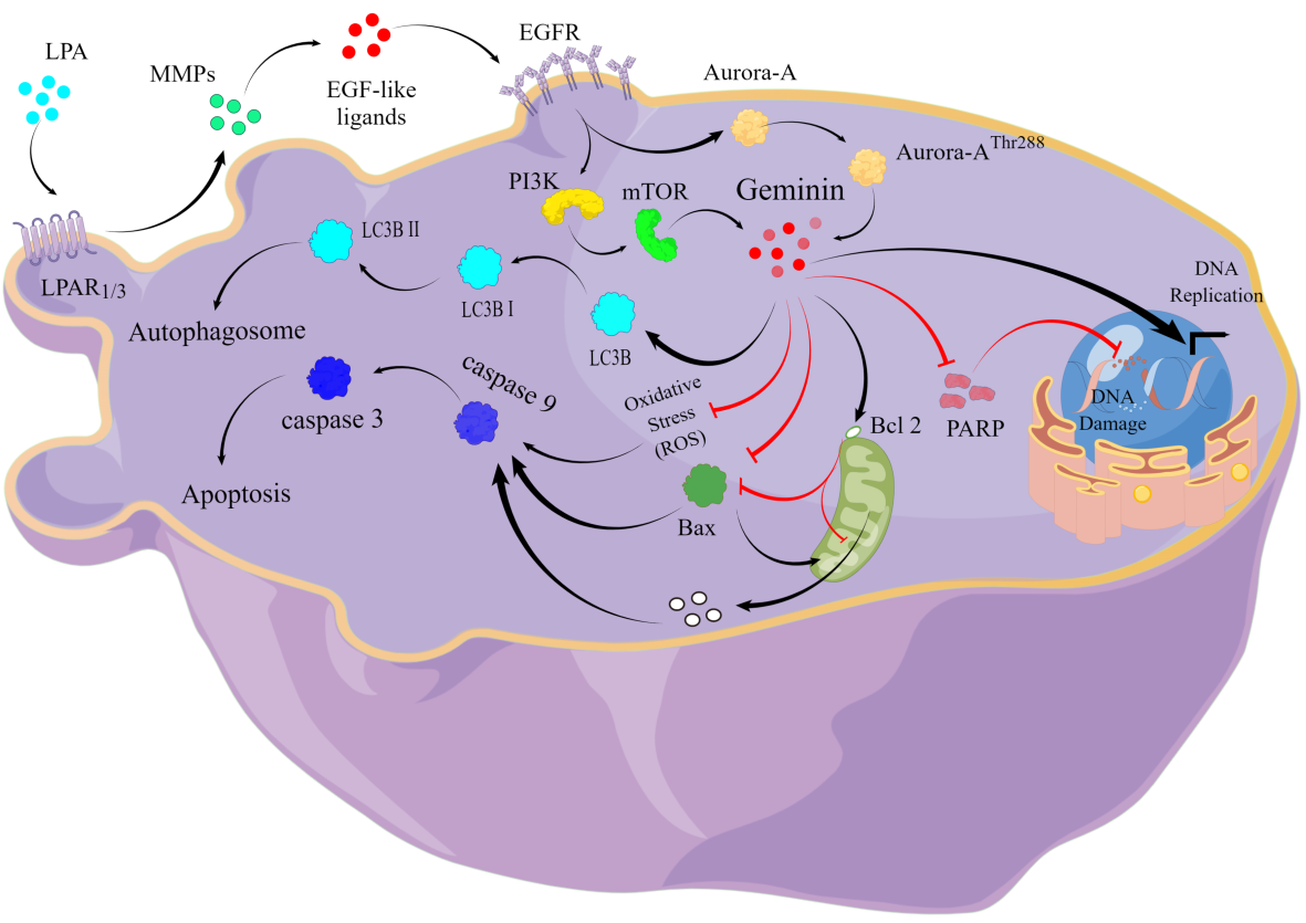 团队在HGSOC卵巢癌研究中,发现复制起始负调控因子—Geminin的敲除会抑制细胞自噬活动、引发ROS介导的细胞凋亡。而LPA一方面能够通过LPAR1/3/MMPs/EGFR/PI3K/mTOR信号通路增加Geminin的表达量,另一方面会通过EGFR/Aurora-AThr288信号通路增强Geminin的稳定性。最终,Geminin蛋白水平的上调抑制HGSCO细胞的凋亡,并促进卵巢癌细胞快速增殖。成果以"Lysophosphatidic acid suppresses apoptosis of high-grade serous ovarian cancer cells by inducing autophagy activity and promotes cell-cycle progression via EGFR-PI3K/Aurora-AThr288-Geminin dual signalling pathways"为题,发表在肿瘤学领域国际期刊《Frontiers in Pharmacology》(中科院大类二区TOP)。