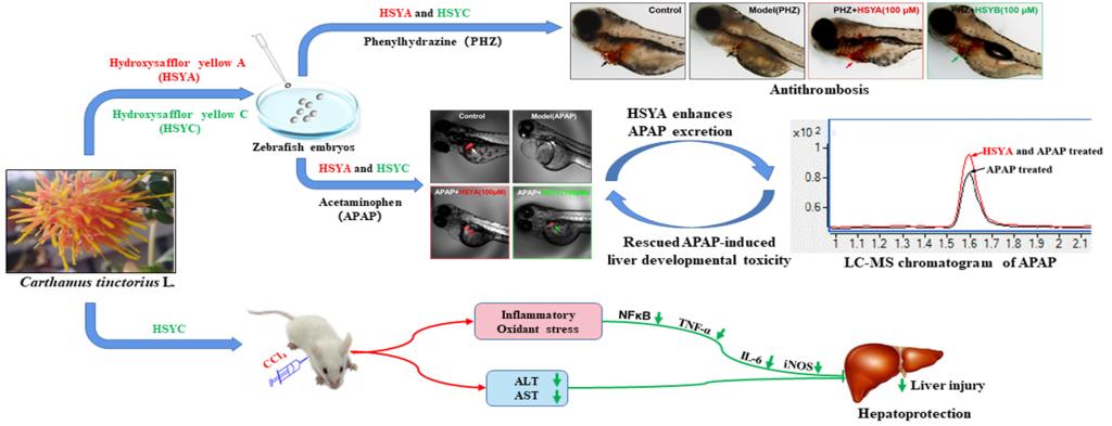研究结果在Phytomedicine发表了题为“Hydroxysafflor yellows alleviate thrombosis and acetaminophen induced toxicity in vivo by enhancing blood circulation and poison excretion”的论文。该研究发现羟基红花黄色素能够有效改善对乙酰氨基酚(APAP)诱导肝毒性损伤及苯肼(PHZ)所致的斑马鱼血瘀,同时能够增强血液循环,改善APAP诱导的斑马鱼形态畸形和肝脏发育迟缓,还可以通过调节NFκB、TNF-α、IL-6和iNOS的表达来降低炎症反应,缓解CCl4诱导的小鼠肝损伤。此外,对APAP和PHZ所致的双重损伤具有保护作用。分析测定显示,羟基红花黄色素A能够抗血瘀、加速斑马鱼体内的APAP排泄,减少APAP对斑马鱼的毒害作用。以上结果提示,羟基红花黄色素及其原药材红花可以提高外源性及内源性有毒物质的排泄速度,这可能是红花净化血液和帮助患者从一些并发症中恢复的主要原因之一。同样,红花及其主要成分可以通过提高毒素排泄速度来保护鱼类和家畜等其它动物少受环境不利物质影响。