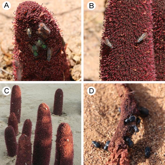 我们知道,被子植物必须通过开花后的传粉过程才能实现种子的结实,比如园艺作物西瓜、甜瓜等水果生产,农作物小麦玉米的生产。这些作物通过传粉结实不仅为自己的下一代的繁殖提供了种子,同时也满足了人类对水果和籽粒的需求。植物为了实现传粉需要依赖不同的传粉媒介,如依赖风传粉的风媒植物,玉米、小麦、高粱、谷子、黍子等;依赖昆虫传粉的苹果、梨、草莓、西瓜、番茄、南瓜等。据估计,80%的被子植物靠昆虫实现传粉。这些植物为吸引特定传粉昆虫类群会提供不同的吸引物,如最常见的花蜜、花粉粒、芳香的气味等。但是有一类植物的花朵会释放与动物粪便、腐肉相似的臭味来吸引蝇类传粉,这种花气味拟腐现象已经在许多植物类群中被发现,如大王花、非洲白鹭花、白星海芋等。然而这种拟腐现象很少在寄生被子植物中报道。寄生植物是一类依靠吸收寄主植物营养实现生长繁殖的异养植物,截至目前已经发现4750多种,现在已经报道的绝大部分寄生植物通过花蜜和花粉粒吸引昆虫传粉。锁阳为锁阳科锁阳属多年生全寄生草本植物,主要寄生在荒漠植物白刺属植物的根部,锁阳是重要的中药材,临床用锁阳补阳气,治阳痿精虚、衰血竭、老年气弱阴虚、大便燥结等。锁阳也是传统的蒙药,能止泻健胃,主治肠热、胃炎、消化不良、痢疾等。锁阳分布在中国的北温带干旱的荒漠地区,如内蒙古西部、甘肃、宁夏、青海、新疆等省(区)荒漠区。锁阳的药用资源绝大部分来自于野生种群,由于连年的挖掘,锁阳已被内蒙古、新疆、青海列入各省(自治区)的《重点保护野生植物名录》,同时中华人民共和国生态环境部在《中国生物多样性红色名录(高等植物卷)》中将其评估为易危等级。为了制定锁阳的繁育保护策略,陈贵林教授研究团队持续开展了锁阳的繁殖生物学和传粉生物学研究。根据博士研究生王德慧在阿拉善左旗对锁阳自然种群的观察,锁阳集中在每年春季4月中下旬花序(锁阳头)出土,5月上旬开始开花,整个花序上密集生长着大量的非常小的雌花和雄花,雄花的花药开裂释放大量细小的花粉粒,当昆虫落到花序上会触碰花药,黏附花粉。有趣的是,锁阳会散发苯酚、对甲苯酚,吲哚,二甲基二硫醚和辛醇等臭味物质来吸引蝇类传粉者,包括家蝇、花蝇、丽蝇、麻蝇等10种昆虫,当这些昆虫嗅到臭味物质就会飞到锁阳花序上,但是它们并不能在锁阳花序上找到与臭味相对应的食物,它们只好携带着花粉粒飞向其他散发着臭味的花序继续寻找食物,顺便实现了锁阳的传粉。通过授粉试验证明锁阳是自交不亲和的植物,同一花序上雄花的花粉粒并不能让雌花完成正常授精,因此锁阳花序上的雌花需要来自另一个花序上的花粉粒才能完成传粉和授精,产生种子。由此体现了这些苍蝇在锁阳繁殖过程中的重要性。同时我们通过传粉媒介试验发现风也能起到辅助的传粉作用。在清楚了锁阳传粉机制的基础上,我们在一些臭味不够浓的锁阳种群的花序上使用了少量的二甲基二硫醚和二甲基三硫醚来吸引更多的蝇类传粉者来促进锁阳传粉,锁阳的种子产量增加了20%以上。这项研究成果对锁阳资源的原生态保护,锁阳野生抚育及人工栽培具有重要意义。