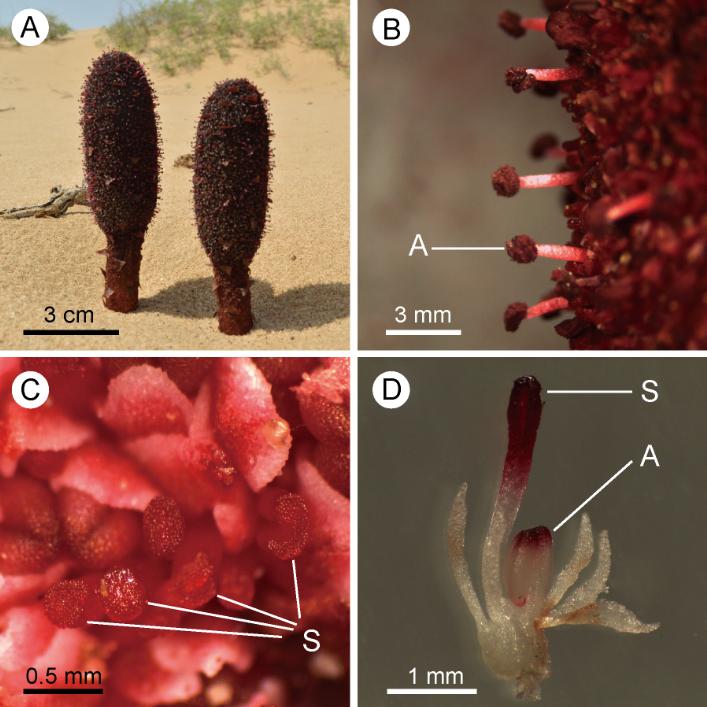图1 锁阳的花:A.花序,B.雄蕊,C.由柱头、未成熟的花药和花被组成的花序平面,D.两性花,成熟的柱头和未成熟的花药