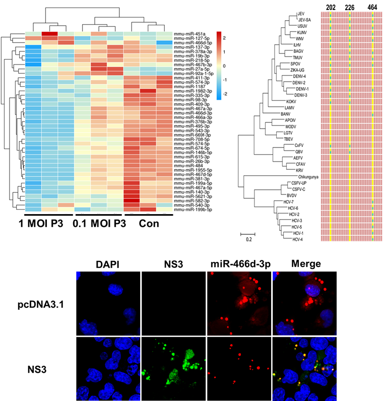 本研究发现JEV编码的解旋酶(NS3)能够导致细胞miRNA的可变剪切体(isomiR)显著上升,并且miRNA的变化促进了炎症相关基因的表达。通过RNA测序、RNA免疫共沉淀和JEV感染性克隆等方法表明,NS3上的精氨酸富集区域特应性吸附前提miRNA(pre-miRNA)并且导致pre-miRNA的错误解旋使miRNA功能失常。并且对比所有黄病毒属病毒发现,西尼罗和病毒、登革热病毒和塞卡病毒等均有类似功能。病毒编码的解旋酶为抗病毒药物的理想靶标位点和疫苗构建基因弱化位点,本研究有助于进一步抗病毒药物研制提供科学依据。