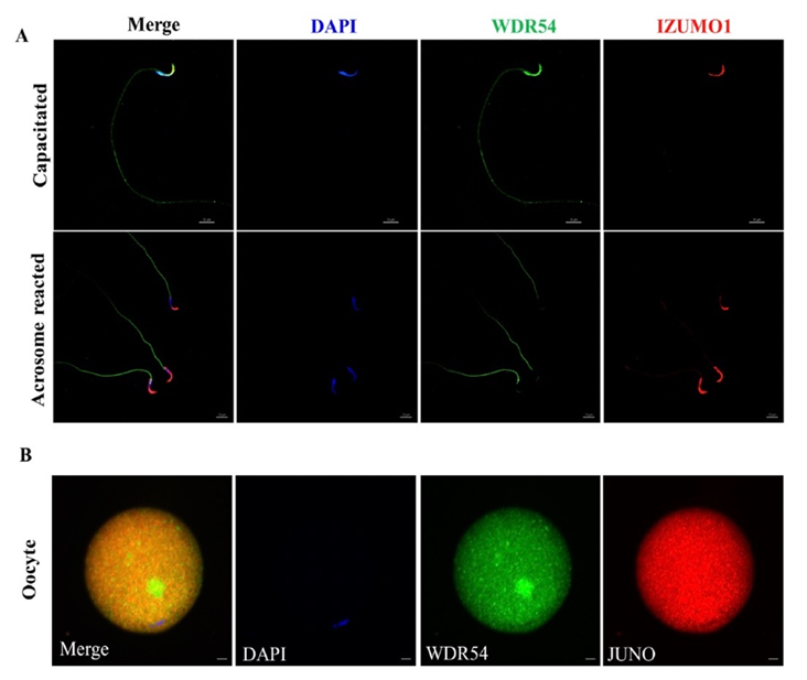 精子和卵母细胞膜的识别和融合对于哺乳动物的遗传和进化具有关键作用,这一过程需要精子和卵母细胞表面蛋白质之间的相互作用,特别是精子的IZUMO1与其卵子上的受体JUNO之间的相互作用。但异源表达IZUMO1和JUNO的体细胞混合实验显示,IZUMO1与JUNO的互相识别只能介导体细胞黏附,而并不能导致细胞膜融合,因此在受精过程中一定还有其它蛋白质协助IZUMO1和JUNO来完成膜融合。基于这一假说,邢万金和苏慧敏团队前期以IZUMO1和JUNO为诱饵,筛查小鼠睾丸和卵巢cDNA文库,发现一些可能与IZUMO1或/和JUNO结合的蛋白质。本研究选择WDR54为研究对象,用生物信息学方法和细胞分子生物学技术,确认了WDR54既能与IZUMO1结合,又能与JUNO结合,揭示了其在大鼠精子和卵子上的定位及与IZUMO1和JUNO的共定位,并发现抗WDR54抗体能显著抑制大鼠体外受精率,说明WDR54通过与IZUMO1和JUNO的相互作用参与精卵融合。这项研究首次发现既能与IZUMO1结合又能与JUNO结合,且影响精卵融合的蛋白,为解析哺乳动物精卵融合的分子机制提供了新的线索,打开了新的视野。该成果以“Participation of WD repeat containing protein 54 (WDR54) in rat sperm-oocyte fusion through interaction with both IZUMO1 and JUNO”为题发表在农林科学的Top期刊Theriogenology(中科院SCI二区)上(doi: 10.1016/j.theriogenology.2023.10.031)。该研究得到了国家自然科学基金(32060173,32260832)、内蒙古自然科学基金(2022MS03046,2020MS08098)、内蒙古自治区细胞分子调控重点实验室项目(2021PT0002)及本科老员工创新创业训练计划(202214303)的资助。suncitygroup太阳集团2019级博士研究生来兄为本文的第一作者,苏慧敏副教授和邢万金教授为共同通讯作者。