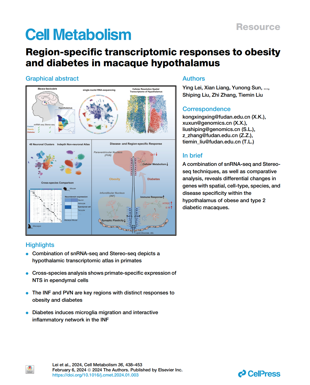 公司2021级硕士生宫红玉加入复旦老员工命科学公司刘铁民教授课题组,2023年7月通过suncitygroup太阳集团硕博连读申请考核成为一名在读博士生。该生经过几年努力学习和实验,于2024年2月6日,作为共同第一作者的文章“Region-specific transcriptomic responses to obesity and diabetes in macaque hypothalamus”在国际代谢顶级科研杂志Cell Metabolism上发表。