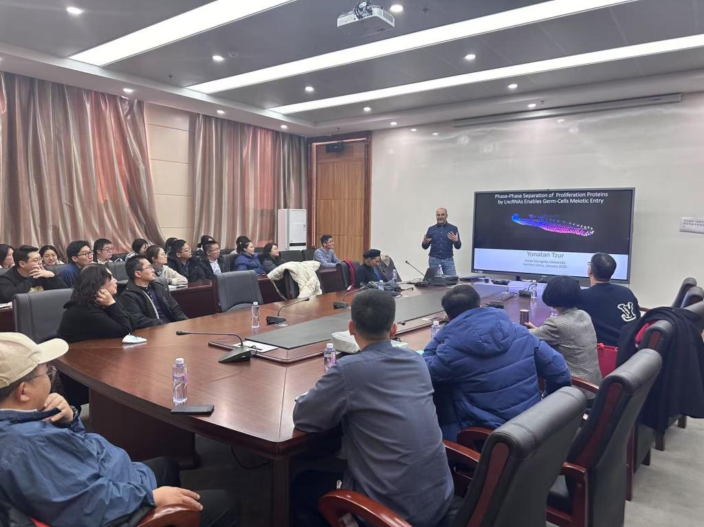 Yonatan B. Tzur教授长期致力于生殖细胞发育与衰老、非编码RNA以及基因编辑的研究,相关研究成果发表于Nature Communications、Genetics、Aging Cell、RNA Biology等高水平期刊。 Yonatan B. Tzur教授首先对耶路撒冷希伯来大学做了简要介绍并欢迎太阳集团官方网站师生前往访问,随后与现场师生积极互动,指出减数分裂中染色体分离异常造成的非整倍性在哺乳动物卵细胞中出现的概率高达40%-60%。Yonatan B. Tzur教授在报告中着重介绍了非编码RNA对秀丽线虫生殖腺发育及生殖干细胞维持的调控作用。三个长链非编码RNA linc-4、linc-7和linc-29与生殖腺中表达的转录因子FBF-1、FBF-2结合,通过调控相分离的方式将FBF-1和FBF-2禁锢在生殖腺中特定的生殖颗粒中,进而调控生殖干细胞的分化以及减数分裂的进行。