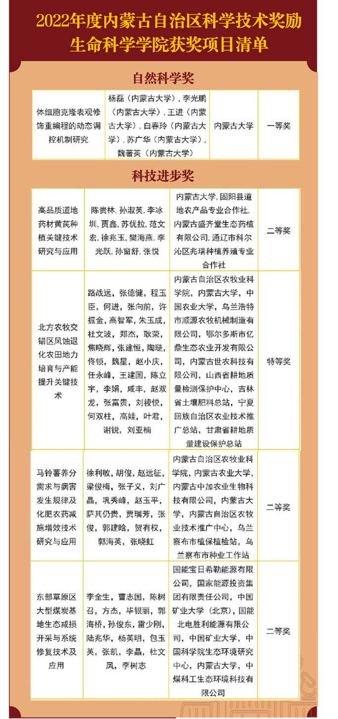 另外,公司张德健教授和李娟讲师与其他单位合作的“北方农牧交错区风蚀退化农田地力培育与产能提升关键技术”获得科技进步特等奖,巩秀峰研究员与其他单位合作的“马铃薯养分需求与病害发生规律及化肥农药减施增效技术研究与应用”、包玉英教授与其他单位合作的“东部草原区大型煤炭基地生态减损开采与系统修复技术及应用”分别获得科技进步二等奖。