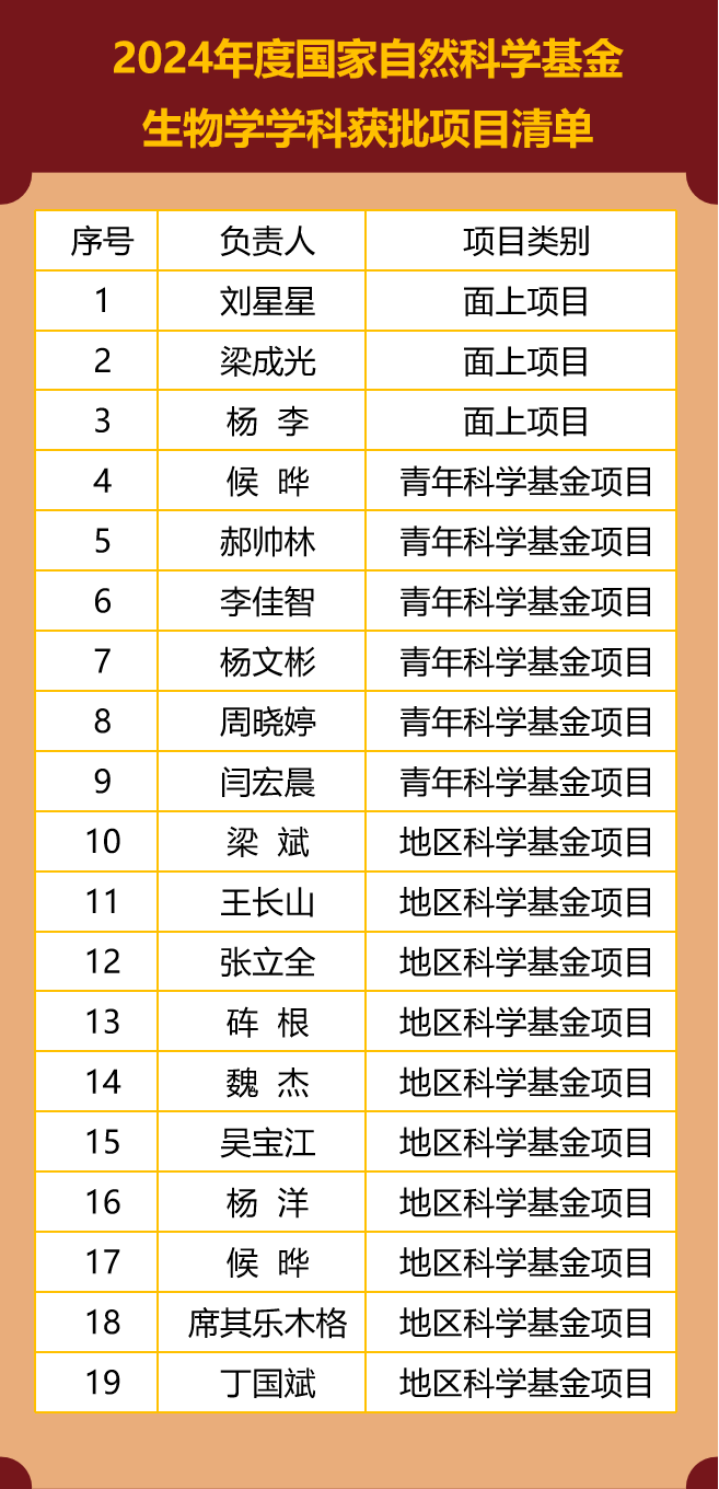 近日,国家自然科学基金委员会公布了2024年度申请项目评审结果,生物学学科共获准各类项目19项,获批直接经费650 万元(包括生物医学研究院)。其中包括3项面上项目、6项青年科学基金项目和10项地区科学基金项目。