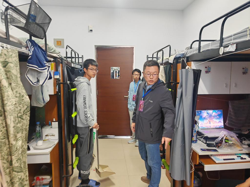 张慧荣与徐军分别深入男女生宿舍与同学们交流,提高同学们的安全防范意识,强调假期离留校时注意消防和出行安全,严禁使用大功率电器,离校时务必将电源等全部关闭,针对检查中发现的问题要求现场整改。同时,对同学们的学习、生活进行进一步了解。