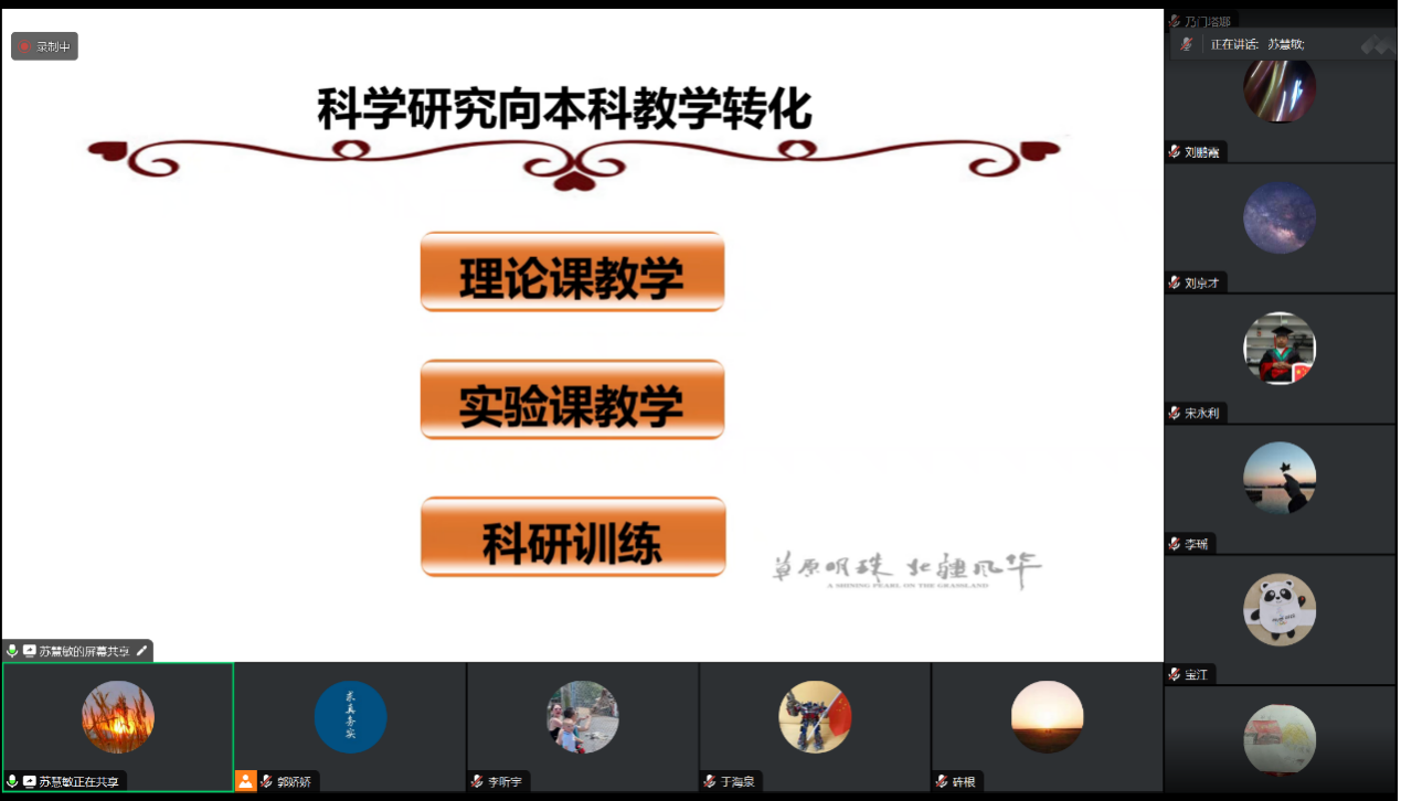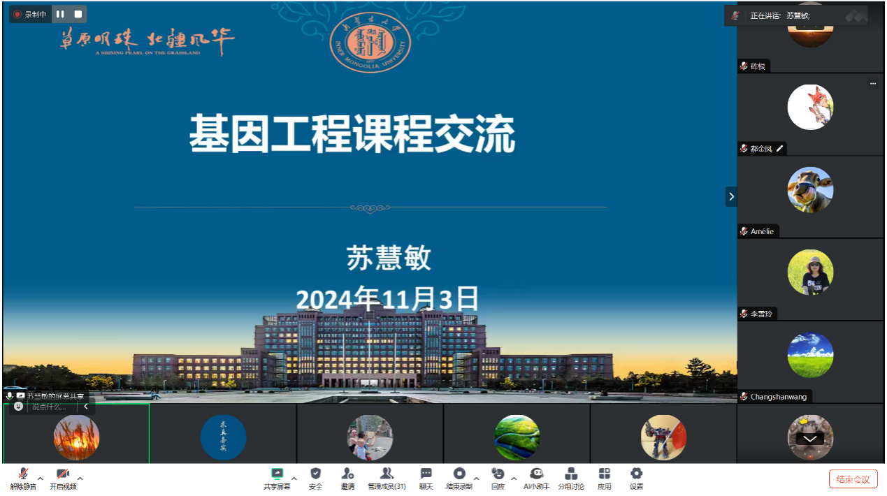 遗传与基因工程教研室和细胞生物学教研室联合举办了线上教学交流研讨会,来自两个教研室的32名教师参与了本次研讨会。会上,内蒙古自治区高等公司产品成果奖、内蒙古自治区五一劳动奖章获得者苏慧敏副教授从课程定位和课程目标、课程思政、教学内容和课程设计、教学模式、教学方法和手段、课程评价几个方面分享了主讲课程《基因工程》的整体设计和课程教学中的宝贵经验,特别是对理学类专业课程的思政教学做出透彻解析,介绍了多种教学手段和方法的应用、教师科学研究向本科教学转化的方式方法,为参会教师提供了丰富的参考,也为教师们改进教学设计,提升教学质量提供了宝贵的思路。