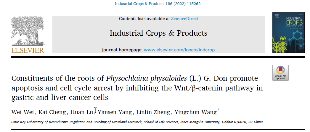 suncitygroup太阳集团牧草与特色作物生物学教育重点实验室王迎春教授课题组于2022年6月在国际知名学术期刊 Industrial Crops & Products(SCI一区TOP)上发表了题为 《Constituents of the roots of Physochlaina physaloides (L.) G. Don promote apoptosis and cell cycle arrest by inhibiting the Wnt/β-catenin pathway in gastric and liver cancer cells》的研究论文 (https://doi.org/10.1016/j.indcrop.2022.115262...